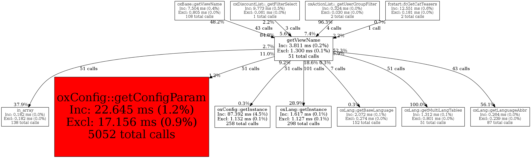 | oxConfig::getInstance | 51 | 14.4% | 230 | 6.0% | 0 | N/A% | 1,096 | 3.2% | 1,784 | 1.8% |