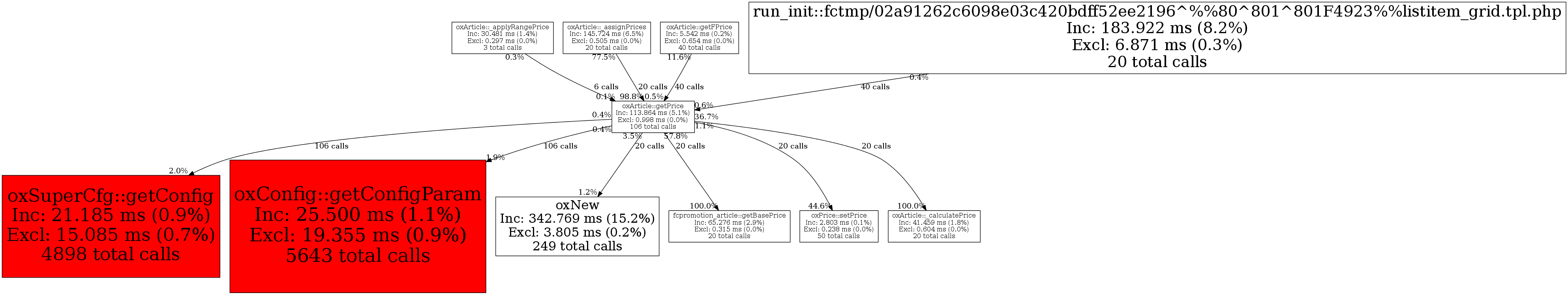 | oxArticle::getPrice | 106 | 26.2% | 113,864 | 5.1% | 40,000 | 4.4% | 707,464 | 3.2% | 917,656 | 4.0% |