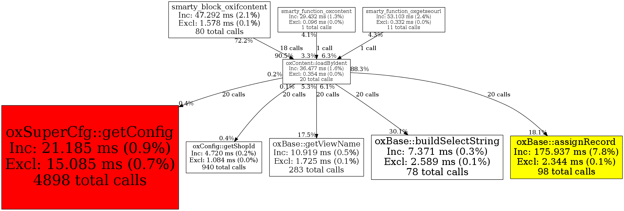 | oxContent::loadByIdent | 20 | 15.9% | 36,477 | 1.6% | 24,003 | 2.7% | 387,336 | 1.7% | 6,272 | 0.0% |