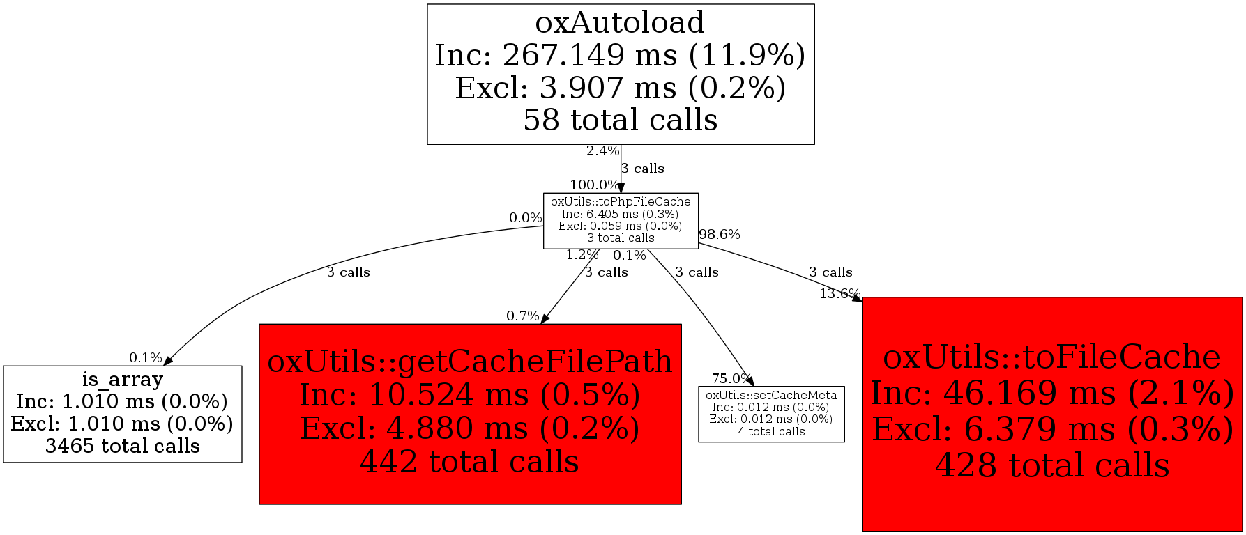 | oxUtils::toPhpFileCache | 3 | 14.3% | 6,405 | 0.3% | 0 | 0.0% | -26,256 | -0.1% | 7,888 | 0.0% |