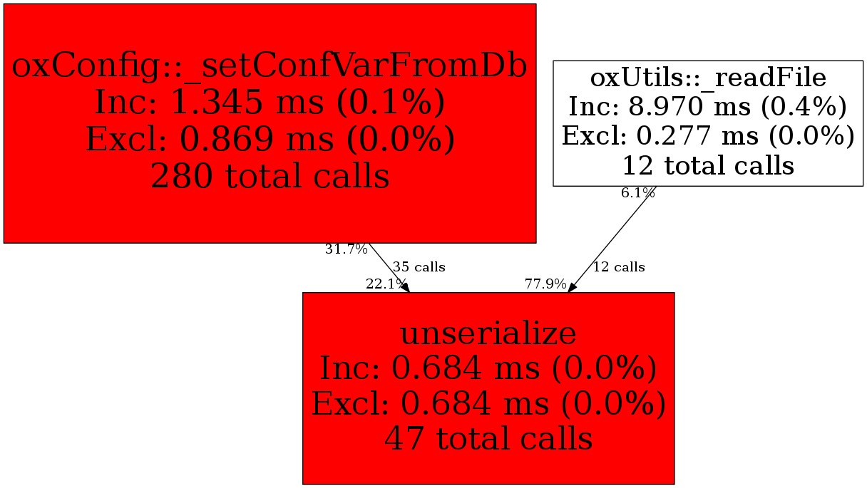 | oxConfig::_setConfVarFromDb | 35 | 74.5% | 151 | 22.1% | 0 | N/A% | 83,640 | 22.8% | 164,808 | 45.2% |