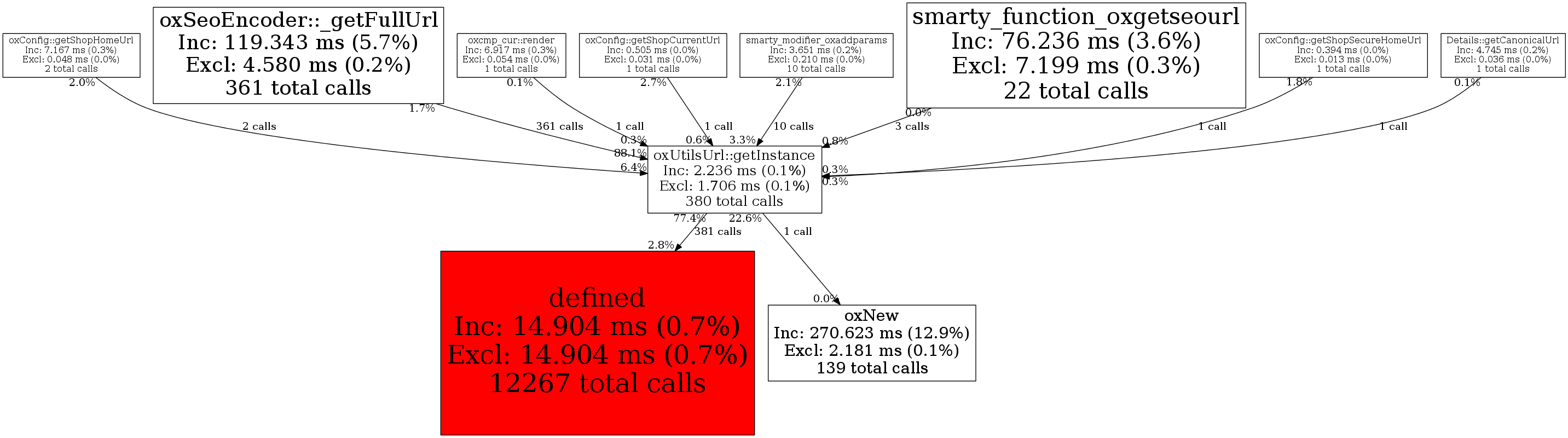 | oxUtilsUrl::getInstance | 380 | 49.5% | 2,236 | 0.1% | 0 | 0.0% | 12,768 | 0.1% | 8,344 | 0.0% |