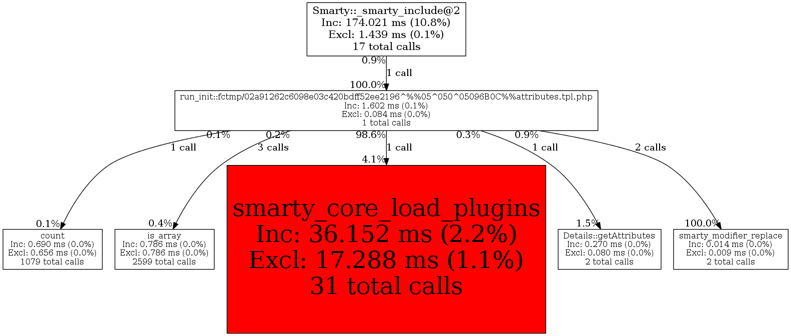 | smarty_core_load_plugins | 1 | 12.5% | 1,496 | 93.4% | 0 | N/A% | 8,256 | 46.6% | 0 | N/A% |