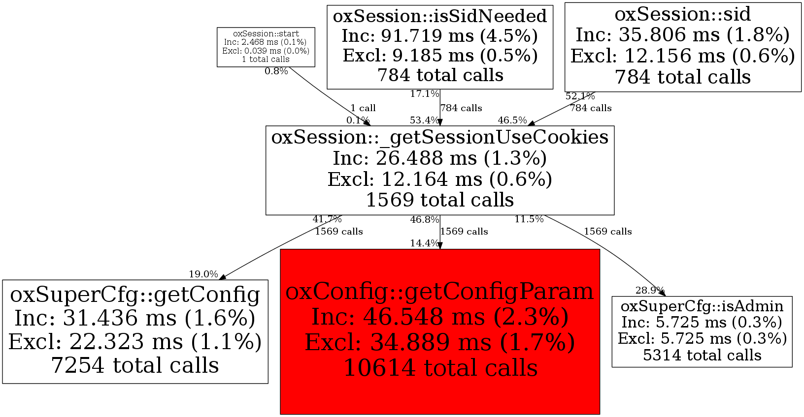| oxSession::start | 1 | 0.1% | 19 | 0.1% | 0 | 0.0% | 5,784 | 4.3% | 3,584 | 61.2% |