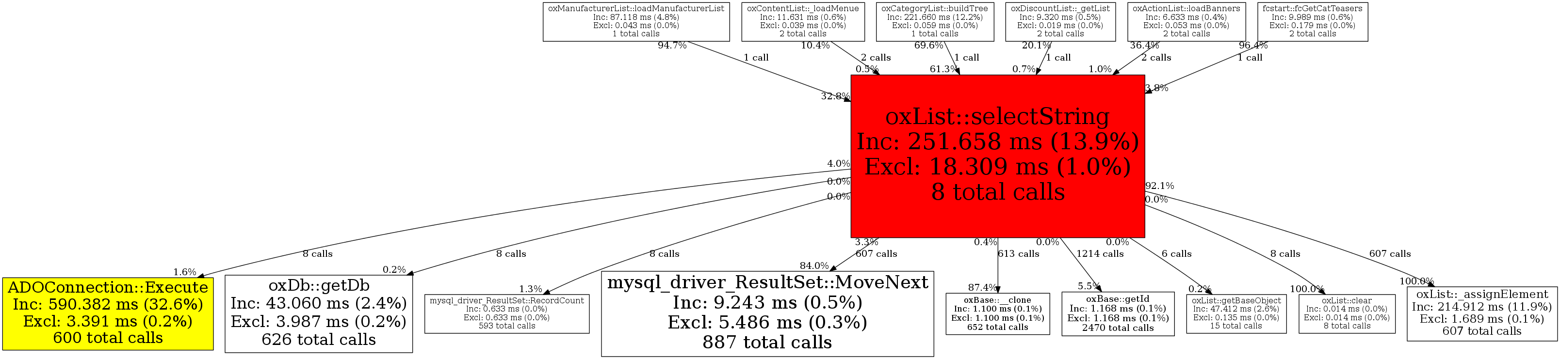 | oxList::selectString | 8 | 0.3% | 251,658 | 13.9% | 244,016 | 26.4% | 11,442,768 | 46.4% | 11,466,768 | 45.7% |