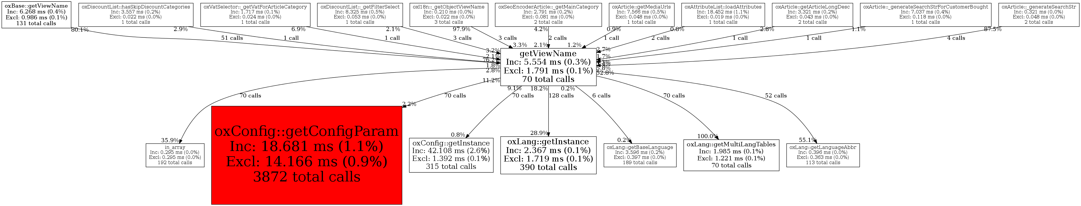 | oxConfig::getConfigParam | 70 | 15.0% | 420 | 7.6% | 0 | 0.0% | 6,696 | 15.4% | 2,824 | 1.7% |
