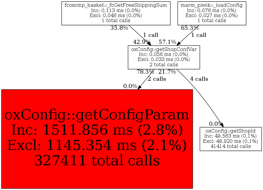 | oxConfig::getShopConfVar | 2 | 14.3% | 56 | 0.0% | 0 | 0.0% | 5,280 | 0.0% | 4,168 | 0.0% |