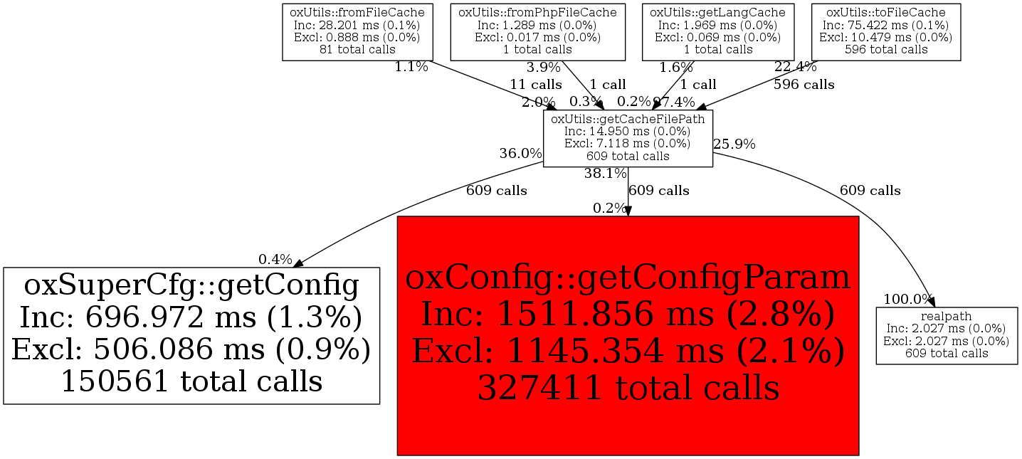 | oxUtils::fromPhpFileCache | 1 | 0.2% | 49 | 0.3% | 0 | 0.0% | 5,872 | 4.5% | 5,928 | 45.7% |