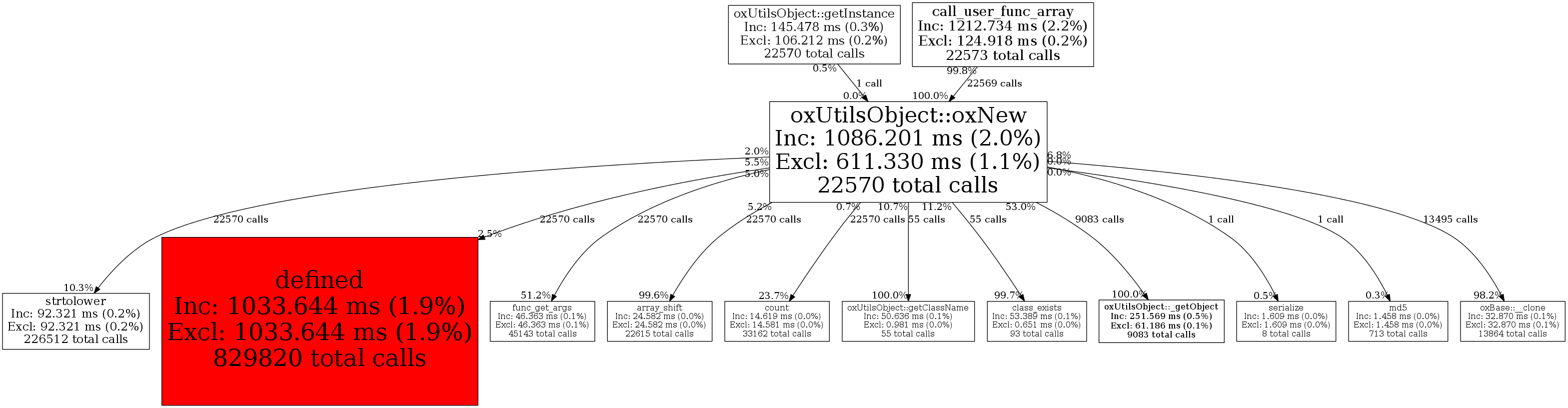 | oxUtilsObject::oxNew | 22,570 | 14.3% | 1,086,201 | 2.0% | 1,024,056 | 3.4% | 157,435,456 | 352.5% | 7,512,384 | 2.2% |