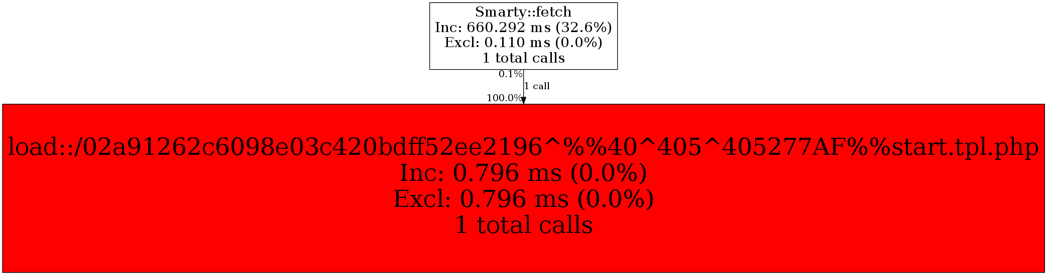 | Smarty::fetch | 1 | 100.0% | 796 | 100.0% | 0 | N/A% | 3,320 | 100.0% | 5,096 | 100.0% |