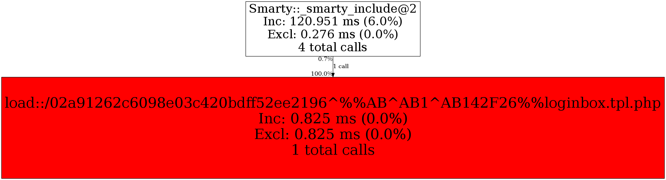 | Smarty::_smarty_include@2 | 1 | 100.0% | 825 | 100.0% | 0 | N/A% | 3,336 | 100.0% | 4,752 | 100.0% |