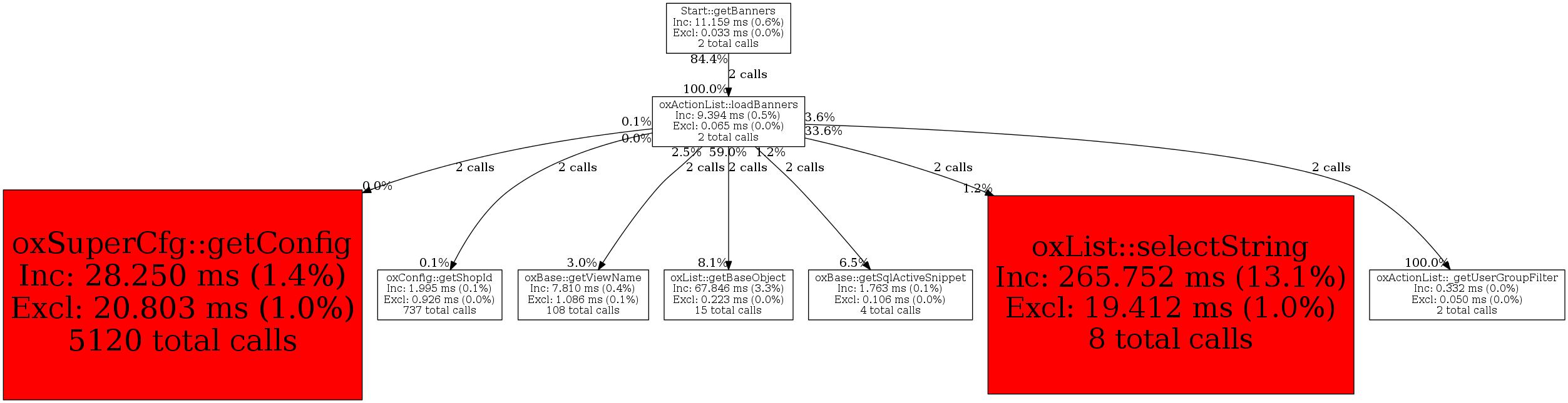 | oxActionList::loadBanners | 2 | 3.6% | 9,394 | 0.5% | 4,000 | 0.4% | 135,472 | 0.5% | 133,288 | 0.5% |