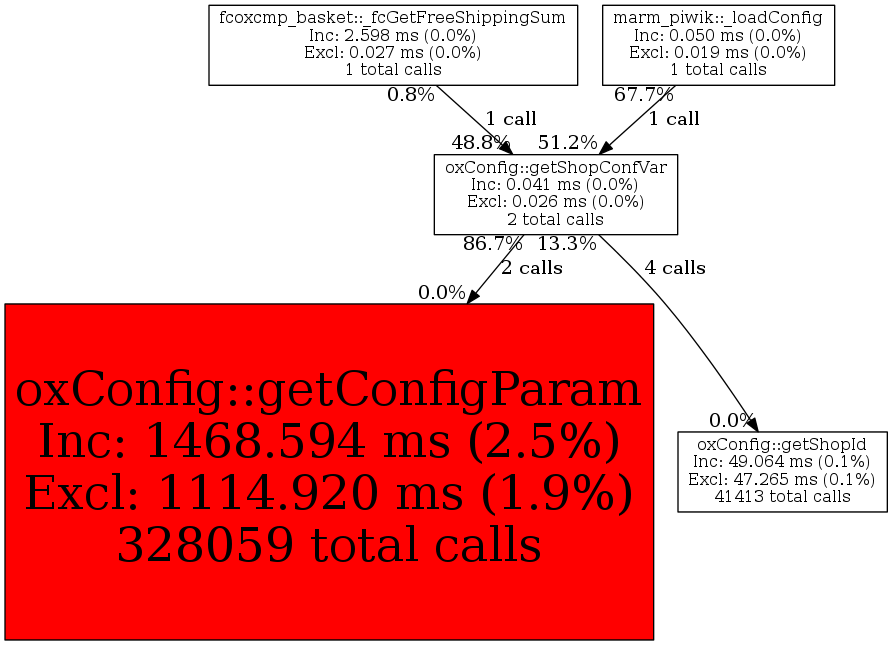 | oxConfig::getShopConfVar | 2 | 14.3% | 41 | 0.0% | 0 | 0.0% | 5,280 | 0.0% | 3,928 | 0.0% |