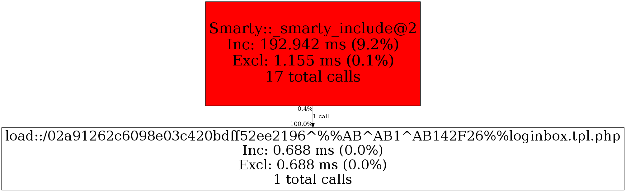 | Smarty::_smarty_include@2 | 1 | 100.0% | 688 | 100.0% | 0 | N/A% | 3,336 | 100.0% | 4,760 | 100.0% |