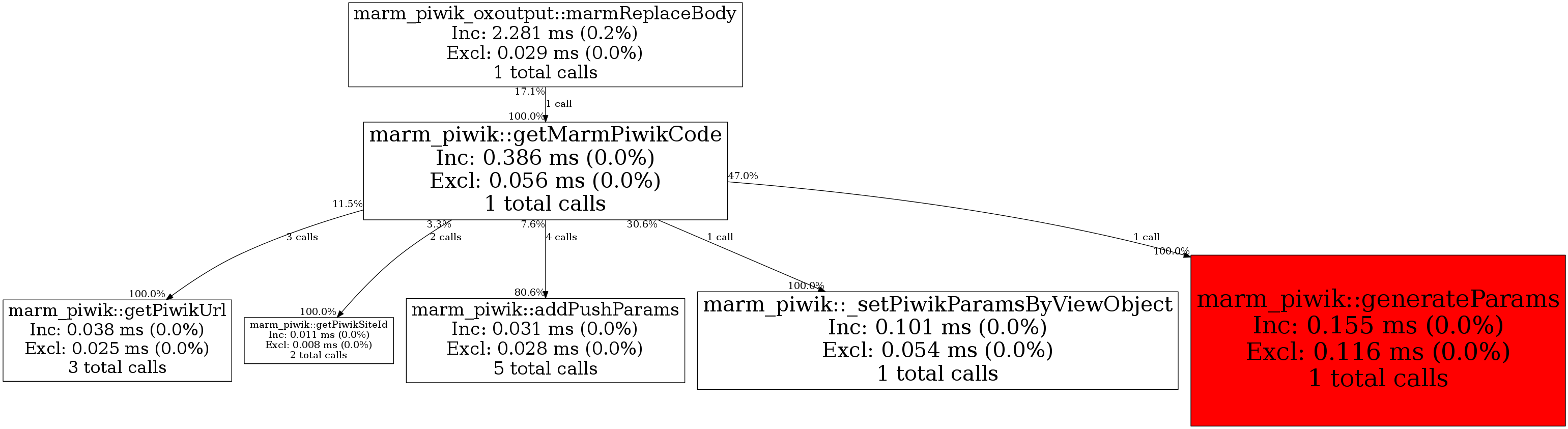 | marm_piwik_oxoutput::marmReplaceBody | 1 | 100.0% | 386 | 100.0% | 0 | N/A% | 51,272 | 100.0% | 14,264 | 100.0% |