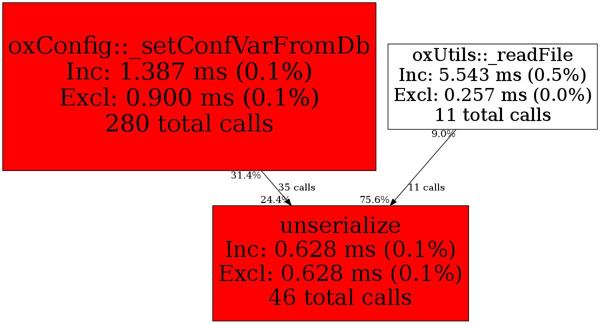 | oxConfig::_setConfVarFromDb | 35 | 76.1% | 153 | 24.4% | 0 | N/A% | 83,648 | 22.8% | 164,912 | 43.6% |