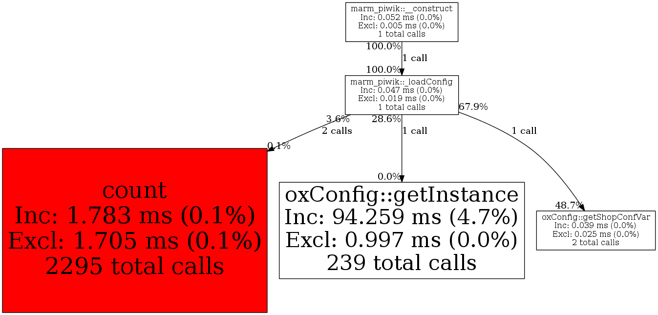 | marm_piwik::_loadConfig | 1 | 9.1% | 47 | 0.0% | 0 | 0.0% | 5,696 | 0.0% | 0 | 0.0% |