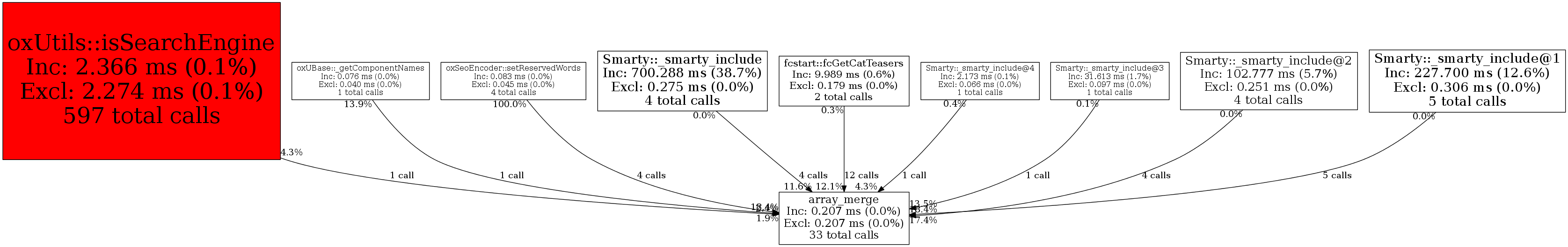 | Smarty::_smarty_include@3 | 1 | 3.0% | 28 | 13.5% | 0 | N/A% | 8,768 | 5.6% | 0 | 0.0% |