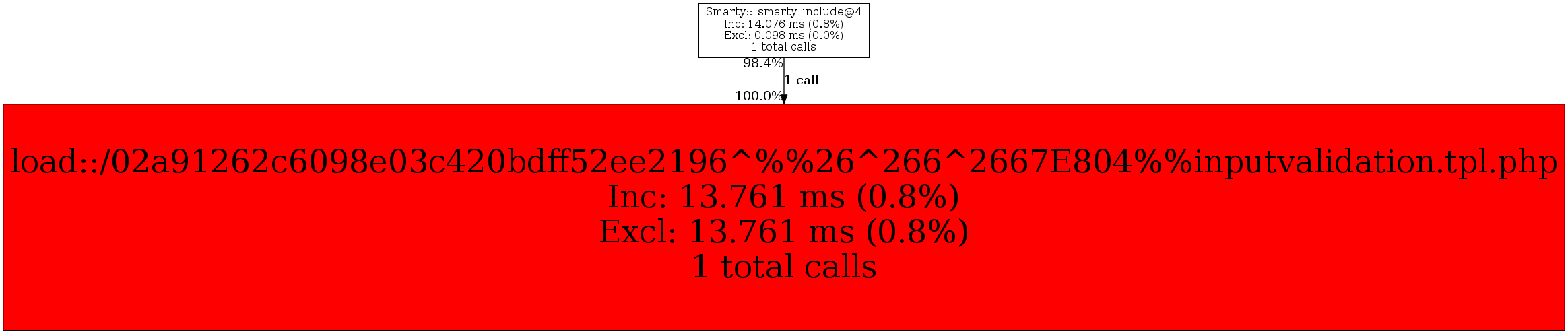 | Smarty::_smarty_include@4 | 1 | 100.0% | 13,761 | 100.0% | 4,000 | 100.0% | 3,384 | 100.0% | 0 | N/A% |