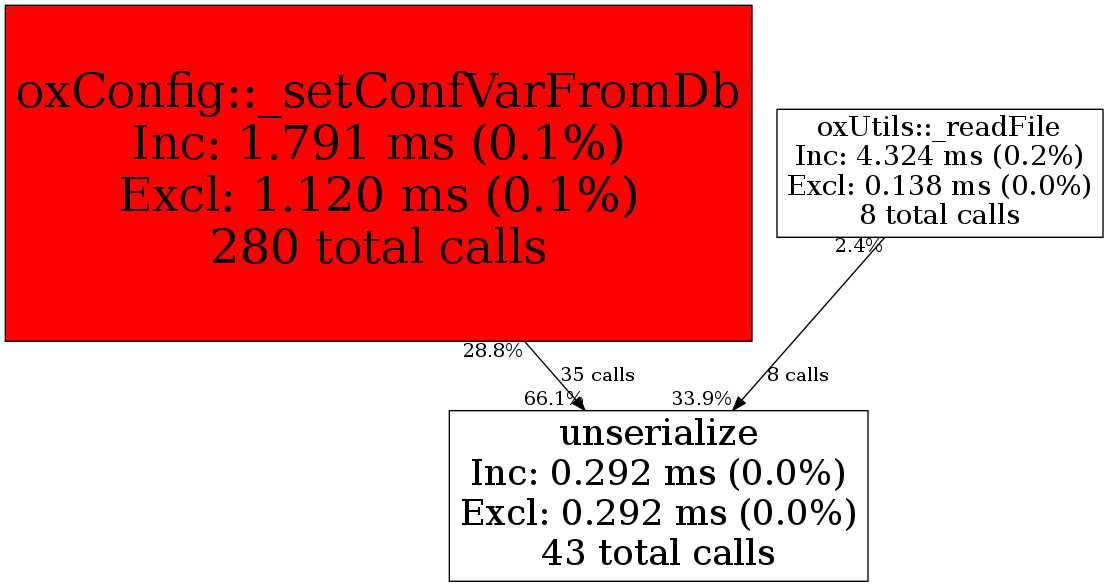 | oxConfig::_setConfVarFromDb | 35 | 81.4% | 193 | 66.1% | 0 | N/A% | 83,632 | 64.1% | 164,816 | 98.8% |
